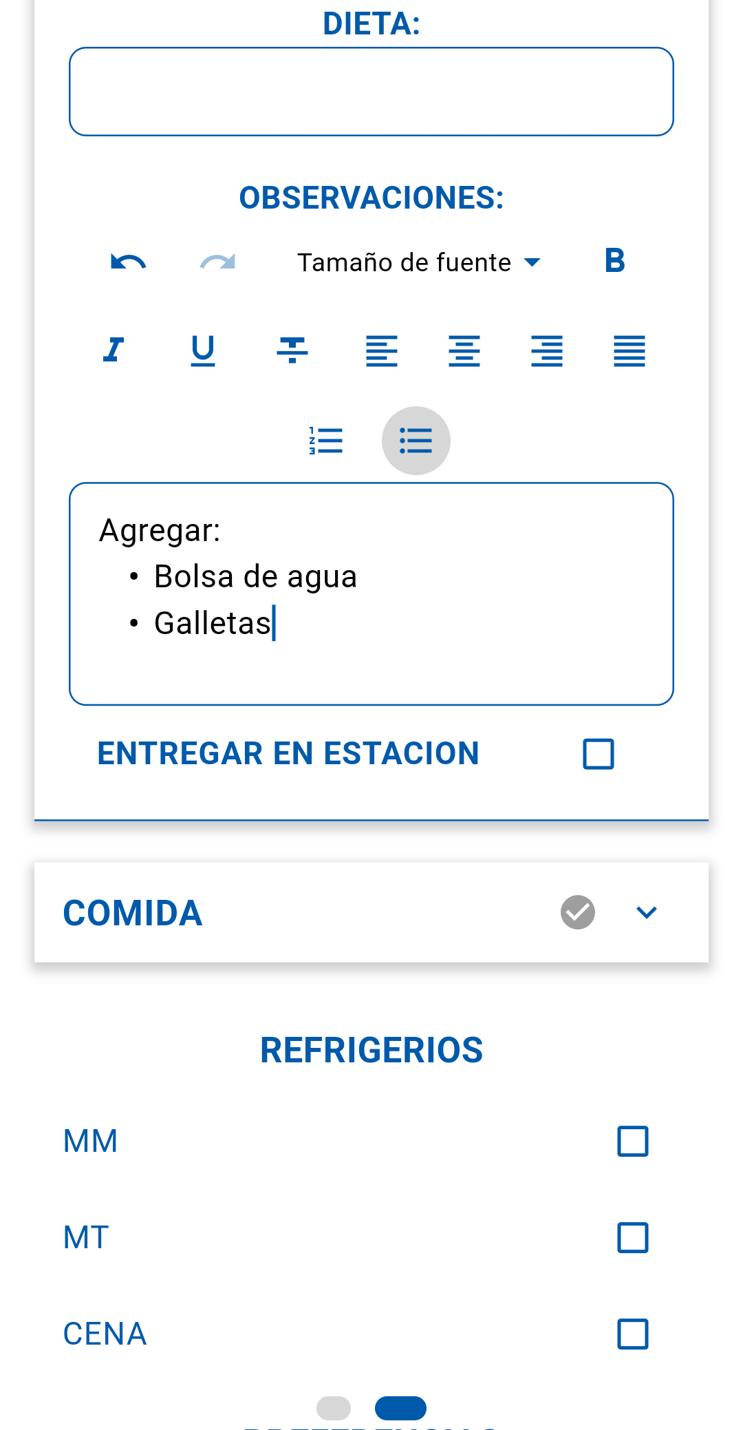 Una vez en la vista de "Visualización de la Información del Paciente", tendrás la opción de crear un ticket para la entrega de alimentos. Desliza la pantalla hacia la izquierda para acceder a las siguientes opciones: