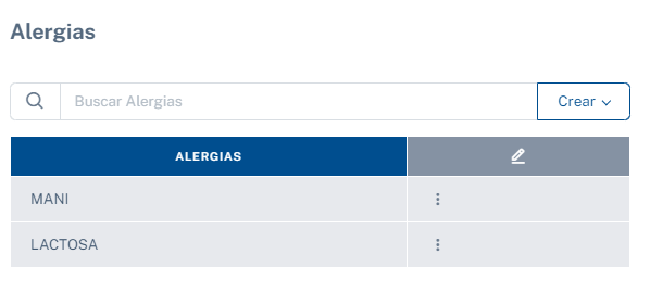 En este panel, podrás crear alergias específicas. Podrás definir las posibles alergias relacionadas con los alimentos y también tendrás la opción de buscar una alergia en particular y verificar si ya ha sido creada.