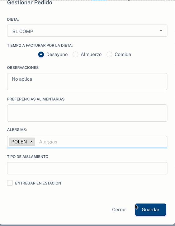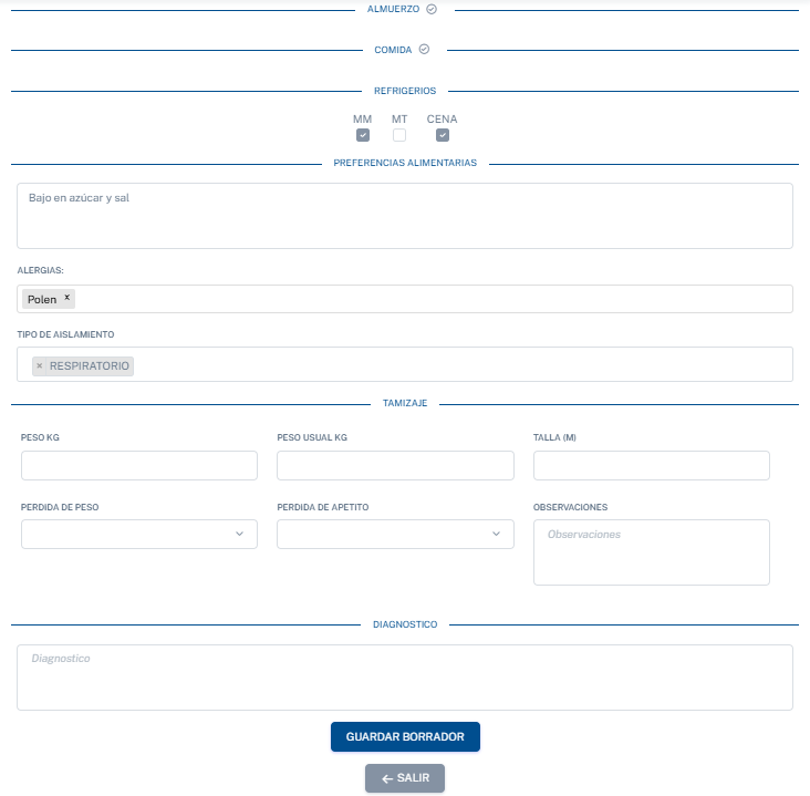 | Identificación | Dieta | Desayuno | Almuerzo | Comida | Preferencias | Alergias | Aislamientos |