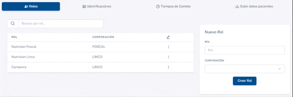 En este panel, podrá administrar los diferentes roles que tienen los usuarios dentro de las corporaciones. Desde esta interfaz, es posible crear nuevos roles, asignarlos a una corporación y editar o eliminar los roles existentes.