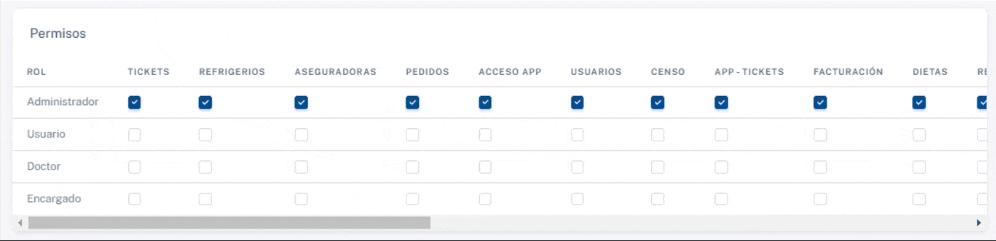 En este panel, podrá obtener un control granular del acceso de los usuarios. Define diferentes roles y sus correspondientes permisos en varias funcionalidades. El sistema utiliza un formato de matriz donde los roles se enumeran verticalmente y los permisos se listan horizontalmente. Las casillas de verificación indican si un rol particular tiene acceso a una característica o sección específica de la aplicación.