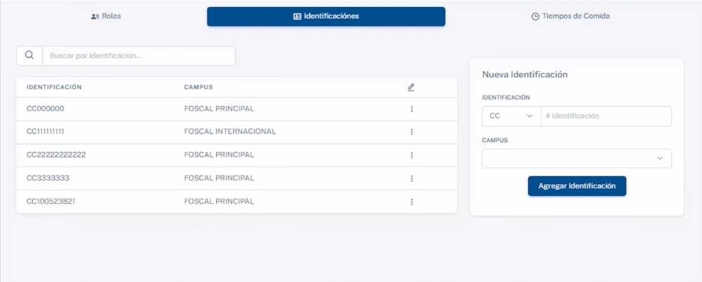 Este panel te permitirá gestionar las identificaciones de los usuarios del sistema. Podrás agregar nuevas identificaciones, editar, eliminar, buscar identificaciones existentes y ver a qué campus pertenecen.