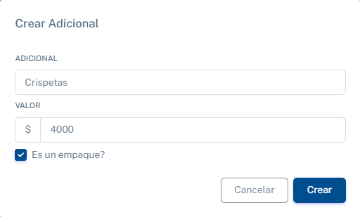 En este panel, podrás crear un alimento o bebida adicional. Tendrás la opción de asignarle un nombre específico, establecer el precio y marcar si es un empaque.