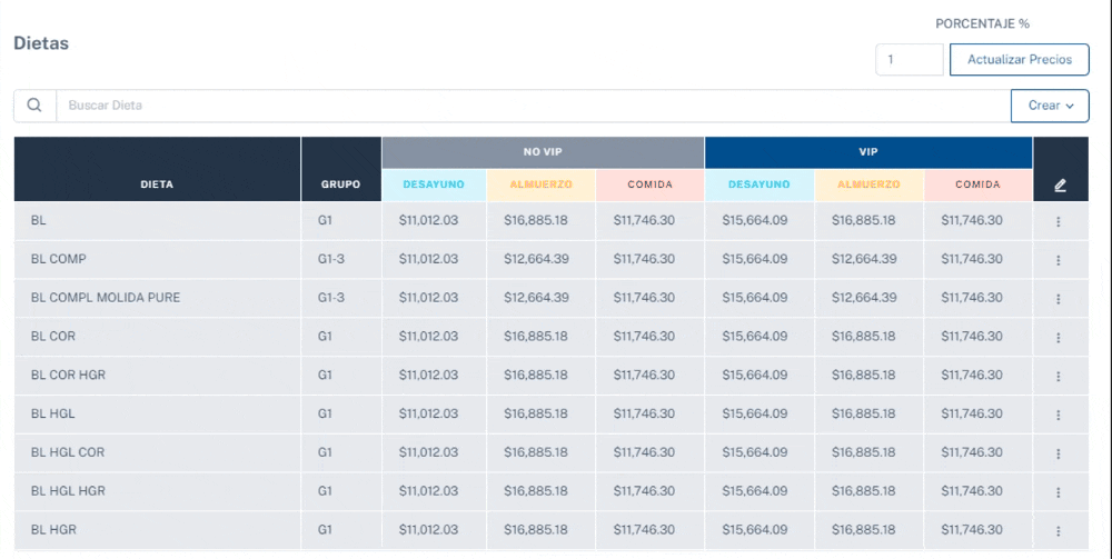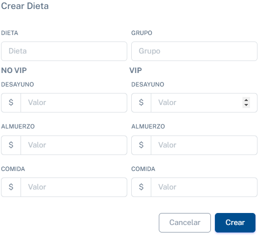 En este panel, podrás crear una dieta adicional manualmente para agregar a la lista de dietas. Tendrás la opción de asignarle un nombre específico, definir el grupo alimenticio al que pertenece y establecer los precios de cada comida según si es VIP o no, de acuerdo a las preferencias del usuario.