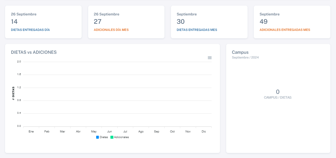 En esta sección, podrás acceder a un resumen estadístico relacionado con las dietas y adicionales entregados. Las estadísticas se desglosan de la siguiente manera: