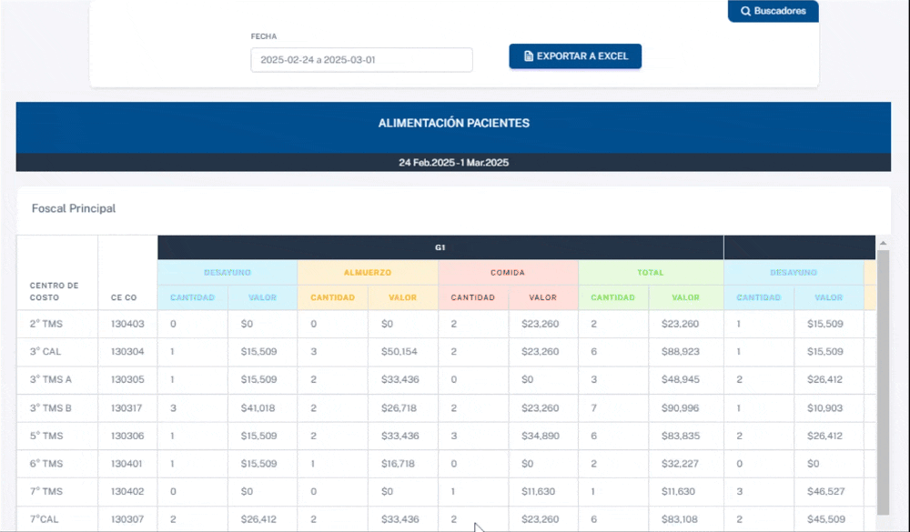 Alimentación Pacientes : En esta sección, podrás visualizar el valor de cada comida despachada al paciente y ver el valor total de la sección.