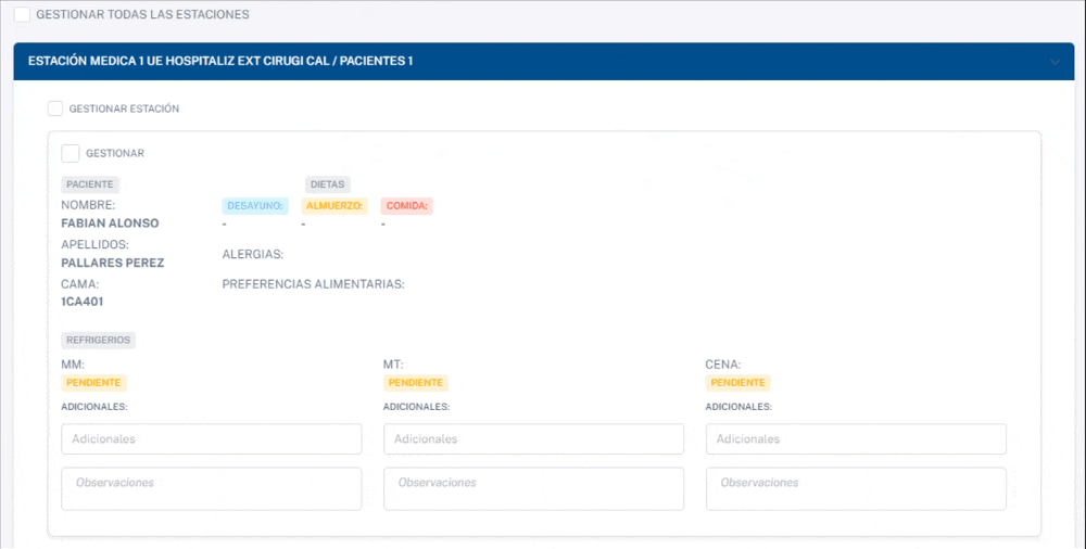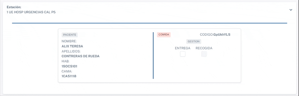 Lista de Nutrición: Encontrarás la información de la estación correspondiente y dispondrás de las opciones para marcar si el plato ya ha sido entregado y si ya ha sido recogido. Cada estación muestra una lista de pacientes. Al hacer clic en un menú desplegable, puedes ver la información detallada del paciente, que incluye: