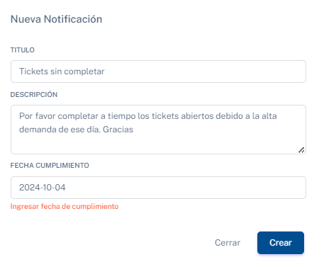 Completa todos los campos y haz clic en "Crear" para guardar la notificación.