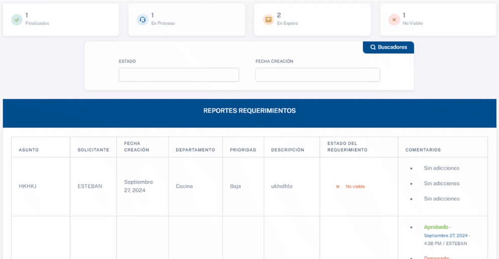 Esta información se podrá filtrar por el estado actual de cada requerimiento y por la fecha de creación.