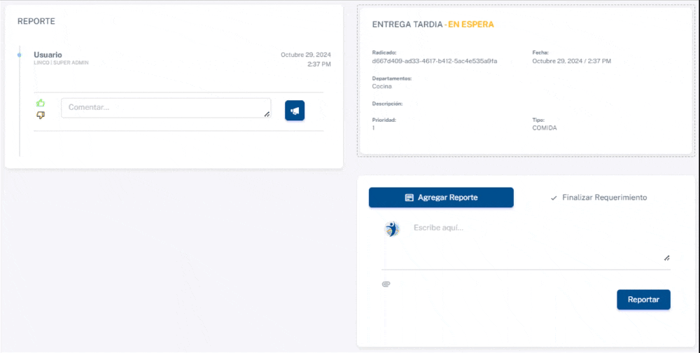 Cuando se hace clic en un requerimiento en la lista de pendientes, se abre esta pantalla que permite revisar y gestionar el progreso del requerimiento seleccionado. Aquí se divide en dos secciones principales: el Reporte (izquierda) y los Detalles del Requerimiento (derecha).