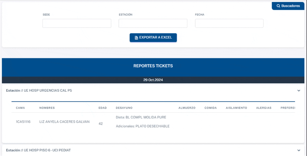 En este panel, tendrá un registro detallado de los tickets, que le permite la consulta y exportación de reportes de alimentación para los pacientes. Los usuarios pueden filtrar los datos por sede, estación y fecha, y luego exportar la información a un archivo de Excel.