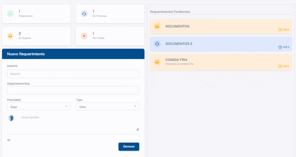 En este panel, obtendrá información sobre los distintos requerimientos. Podrá acceder rápidamente a información sobre los procesos actuales y en espera. También verá la cantidad de requerimientos basados en su estado: finalizados, en espera, en proceso, o si ya se ha determinado que no son viables.