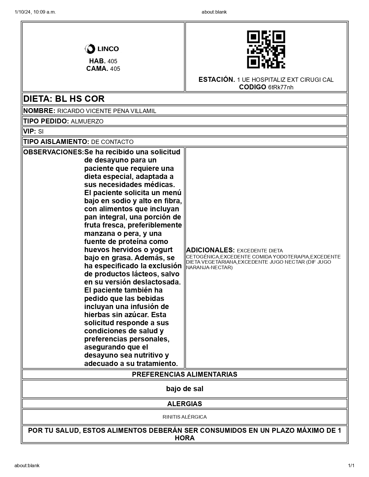 A la derecha de la información del paciente, aparece una sección con el tipo de comida asignada. Esta puede variar según el horario del día: