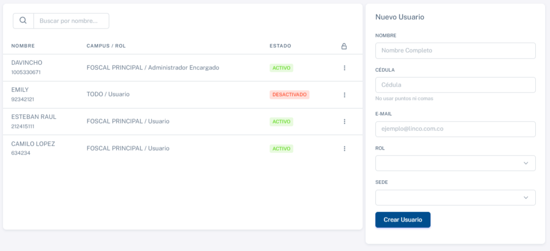 En este panel, podrá visualizar la cantidad de usuarios de LINCO y los usuarios de Foscal. Podrá ver su rol y el campus en el que se desempeñan, con la opción de editar, bloquear y eliminar al usuario.
